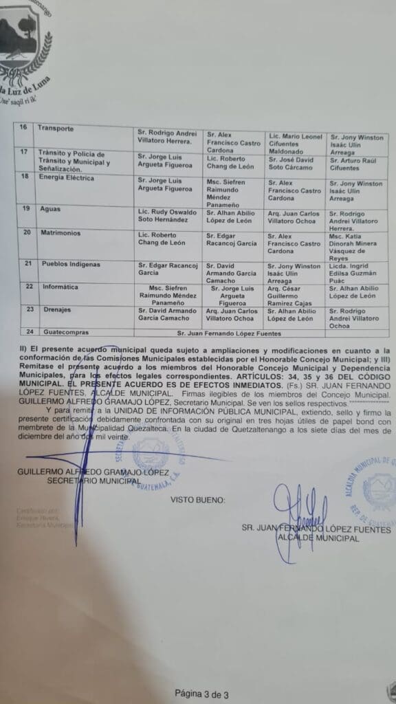 Una de las comisiones del concejo municipal de la cabecera se llama Guatecompras y tiene solo un integrante: Juan Fernando López, el jefe edil. De acuerdo con Rodrigo Lemus, un vecino, esto contraviene el código municipal..