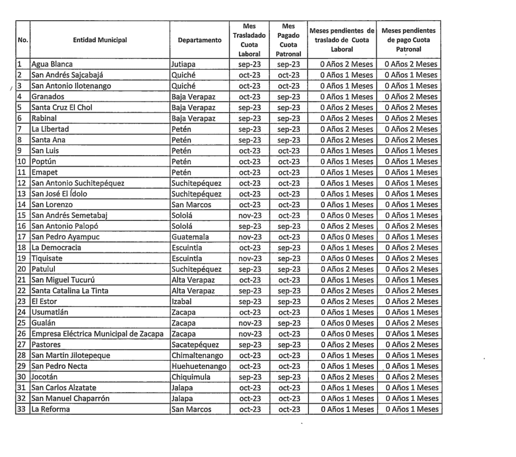 Mixco es la comuna con mayor deuda. De acuerdo con el PPEM, hasta enero de 2024 acumulaba cuatro años y nueve meses sin pagar la cuota patronal; y tres meses sin enviar la cuota descontada de los salarios. Lo mismo sucede en San Miguel Panán, Suchitepéquez, donde el atraso lleva cuatro años y medio. En San Francisco Zapotitlán, también en Suchitepéquez, van tres años y medio.