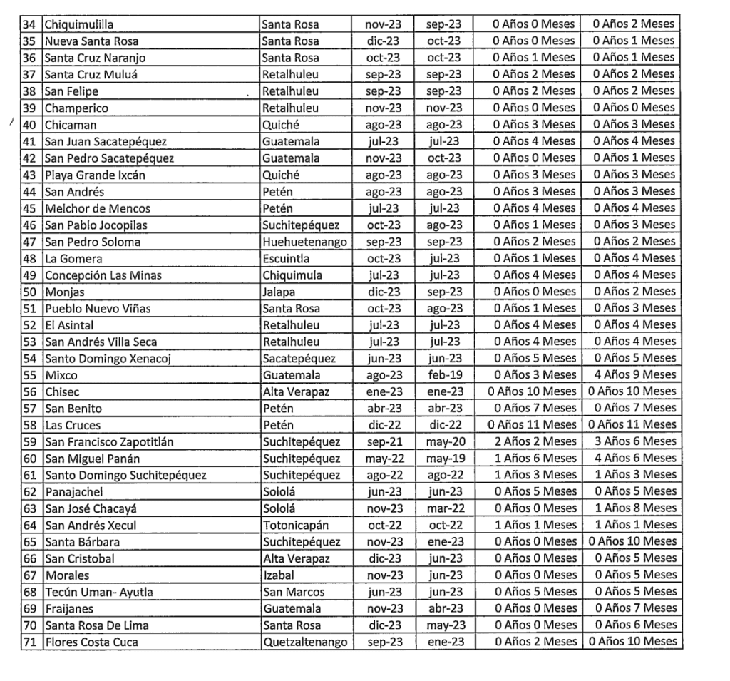 En Santo Domingo Suchitepéquez se debe un año y tres meses de pagos; en San José Chacayá, Sololá, un año y ocho meses. En San Andrés Xecul, Totonicapán, va un año y un mes de retraso y en Las Cruces, Petén, 11 meses.