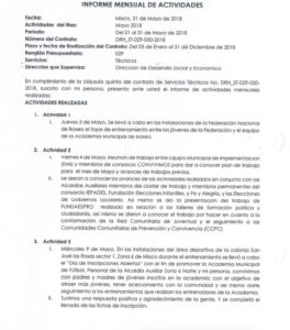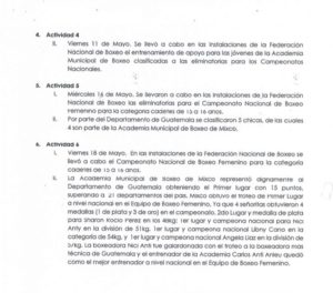 Pero no precisa qué tareas realizó Mazariegos como asesor. La mayor parte de los reportes mensuales que entregó a su superior tratan sobre actividades de la Academia Municipal de Boxeo, la cual no estaba a su cargo, sino de un entrenador.