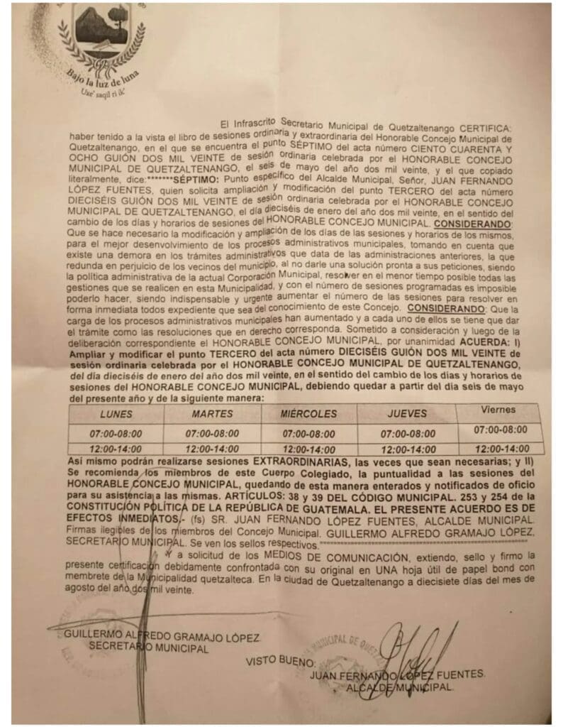 Cada uno de sus miembros (jefe edil, concejales, síndicos y secretario) reciben Q696.87 por cada vez que sesionan, a la semana reciben en promedio de Q5 mil 574. En ocasiones recibieron más porque en 2020 aprobaron un acuerdo que les permite celebrar hasta 10 reuniones a la semana.