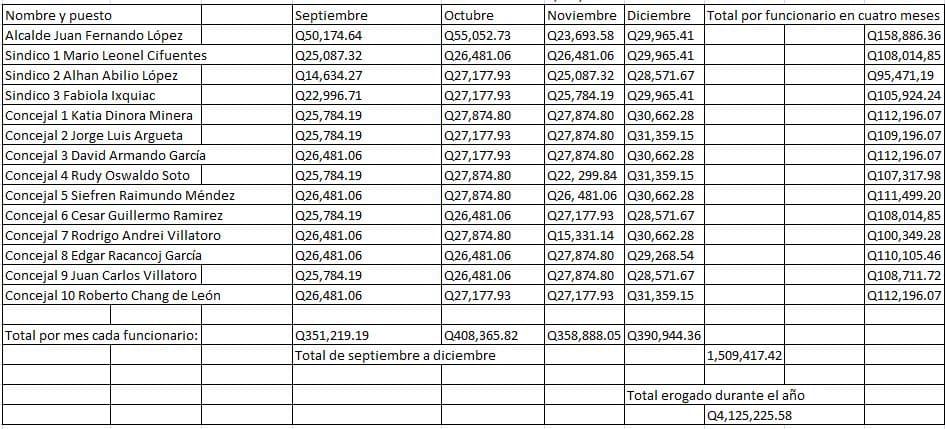 En septiembre 2020 devengó Q50 mil 174 y en octubre Q55 mil 052. El dato puede corroborarse en el sitio oficial la municipalidad.