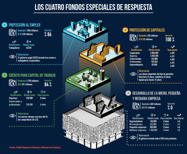 En cuanto al cuarto fondo de rescate –Protección al empleo y Desarrollo de la Micro, Pequeña y Mediana empresa, de Q400 millones (US$51.41 millones)– que fue aprobado el 1 de abril pasado, este aún no funciona. De acuerdo con el ministerio de Economía, el gobierno tramita con el Banco Interamericano de Desarrollo (BID) este préstamo. La oficina de información del BID confirma que está en trámite.