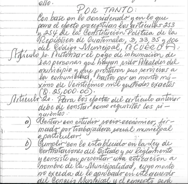 El documento aclara que se puede gastar un máximo de Q25,000, siempre y cuando una trabajadora social contratada por la municipalidad realice un estudio socioeconómico y determine que la familia no cuenta con el dinero suficiente par pagar el entierro. Sin embargo, en este caso, el concejo obvió este requisito y ordenó pagar por todo.