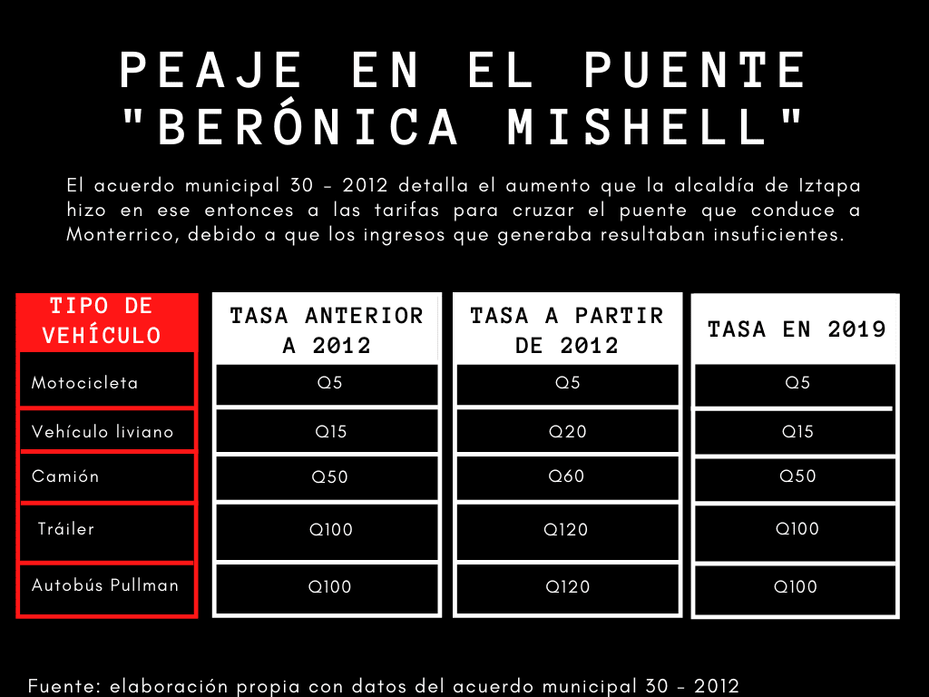 De acuerdo con Katherine Salazar, encargada de información pública de la alcaldía de Iztapa, el cobro por el uso del puente se aprobó el 28 de marzo de 2012, como una tasa municipal. “Entonces no se necesitaba que el Congreso lo aprobara sino solo el concejo”. El acuerdo 030-2012 cobró vigencia el 5 de mayo. 2012.