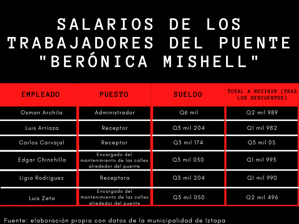 A febrero de 2020, último mes en el que la comuna actualizó su portal de información pública, seis personas estaban a cargo del puente: un administrador, tres receptores y dos empleados responsables del ornato de las calles aledañas al “Berónica Mishell”. Los sueldos de todos, tras los descuentos de la cuota correspondiente al Instituto Guatemalteco de Seguridad Social y a su plan de jubilación, suman Q14 mil 458 al mes.