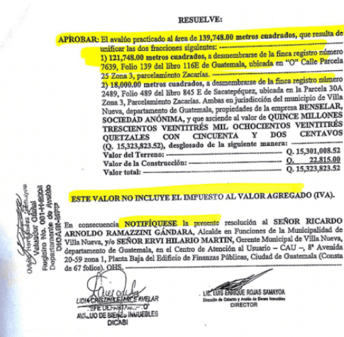 El avalúo que menciona se realizó en 2017 y estableció que los terrenos costaban Q15 millones 323 mil 823, sin el impuesto al valor agregado (IVA). Como dice el artículo 43 de la Ley de Compras y Contrataciones del Estado (LCCE), antes de realizar la compra es necesaria la opinión técnica del ministerio de Finanzas para saber el precio justo del bien, el pago no puede superar esa cantidad.