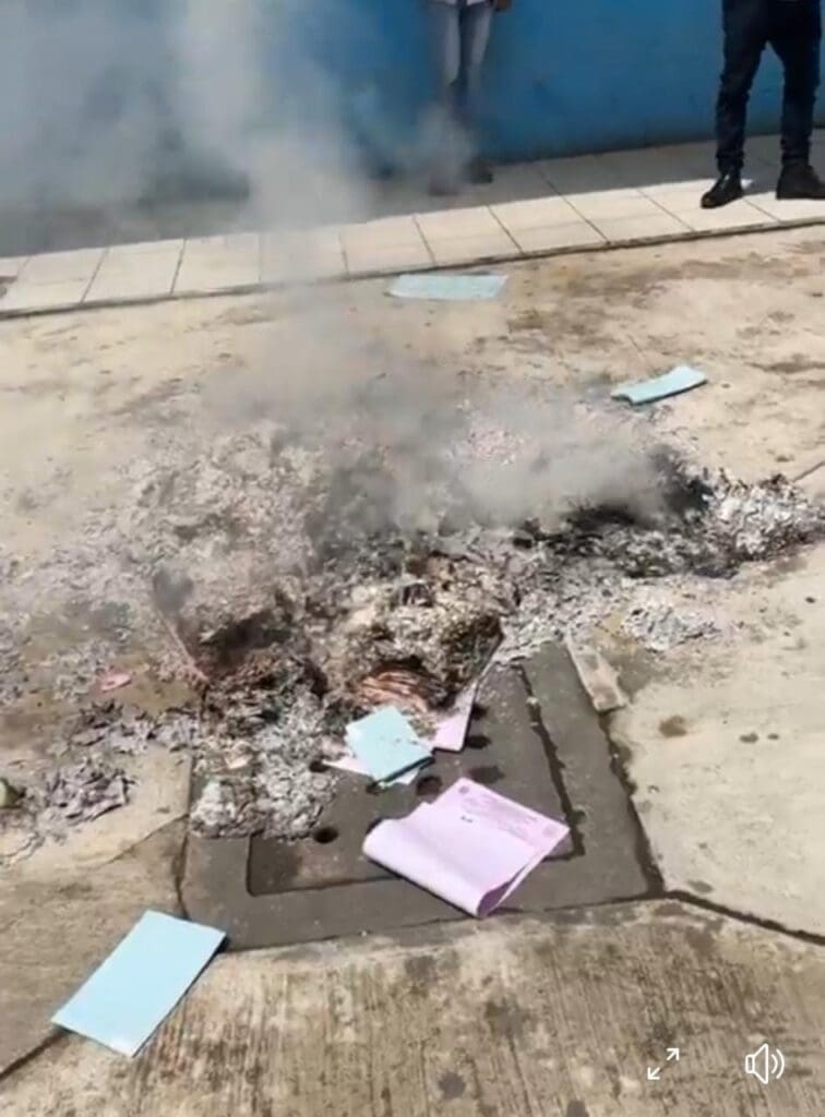 2:31 horas. Chinautla, Guatemala. En la madrugada de este lunes vecinos quemaron las papeletas utilizadas en las elecciones del domingo 25. Al parecer, los inconformes están en contra de los resultados que dan como ganadora de nuevo a la actual alcaldesa, Elizabeth Del Cid Medrano.