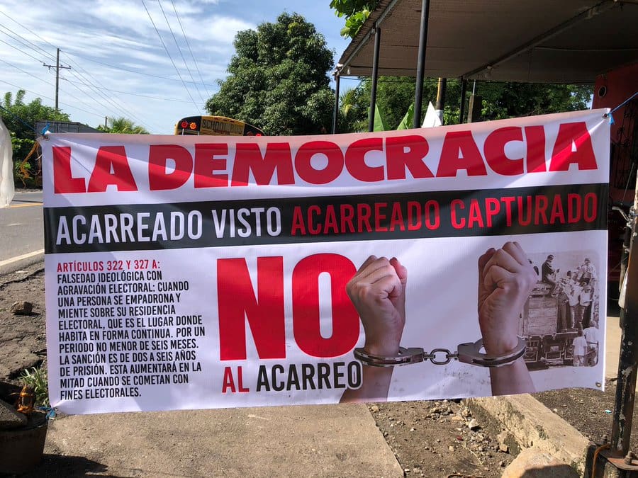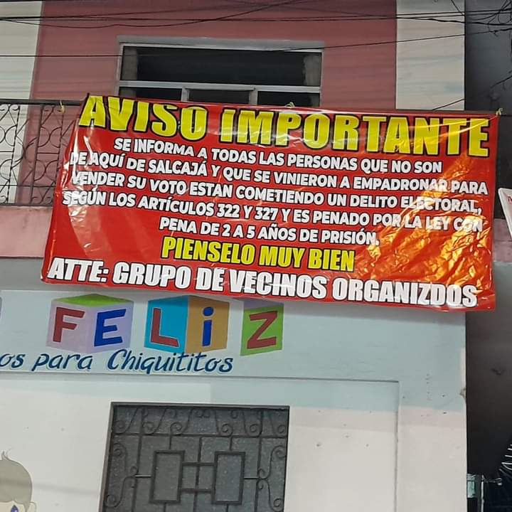 6:00 horas, Salcajá, Quetzaltenango. Vecinos colocaron mantas donde con advierten el delito que se comete al votar en un municipio que no le corresponde. Cita los artículos 322 y 327 del Código Penal, “Falsedad Ideológica con agravación electoral”. Vía Oscar de León.