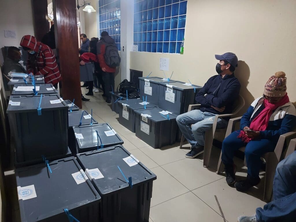 5:01 horas domingo 25. San Pedro Sacatepéquez, San Marcos. En la sede de la Junta Electoral Municipal de San Pedro Sacatepéquez, San Marcos, integrantes de las juntas receptoras de votos comenzaron a las 5:00 horas el traslado de papeletas a los centros de votación con el resguardo de la Policía Nacional Civil.