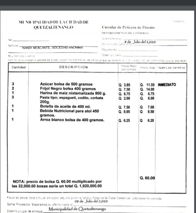 La municipalidad de Quetzaltenango entregará 32 mil bolsas de alimentos que en conjunto costaron Q1.9 millones para paliar la crisis provocada por el confinamiento en la localidad. La empresa contratada es Nandi Mercantil S.A.