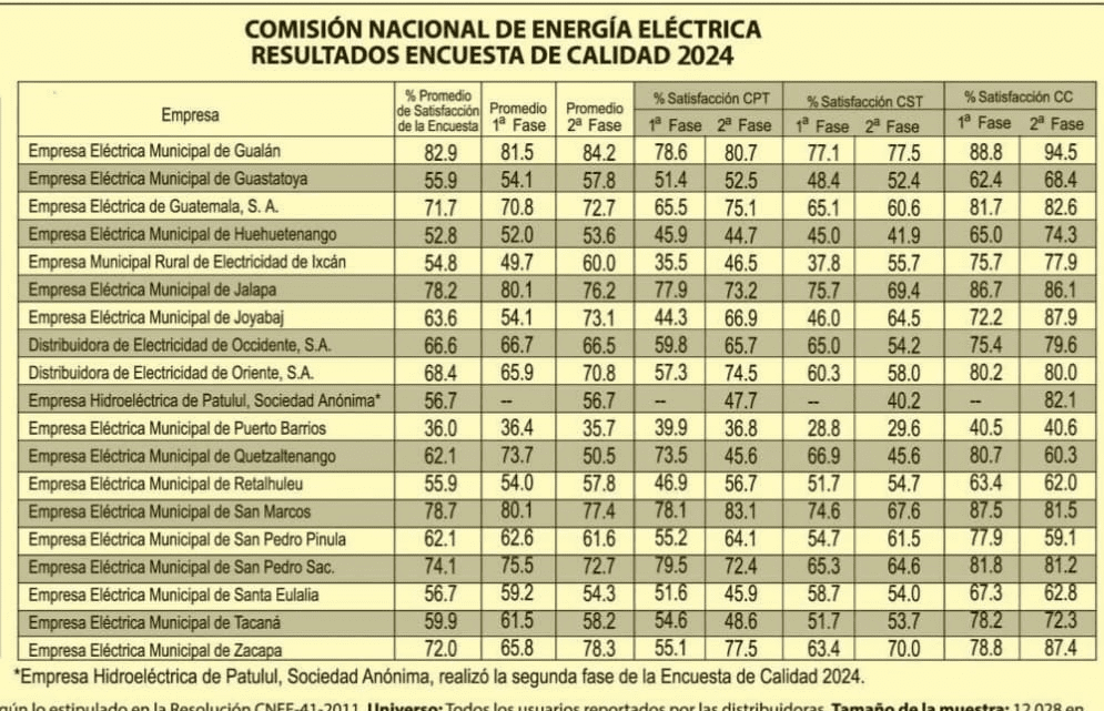 La Comisión Nacional de Energía Eléctrica (CNEE) publicó los resultados de una encuesta en la que evaluaron la calidad de las Empresas Eléctricas Municipales (EEM) durante 2024. Las alcaldías que mejor puntearon fueron Gualán, Zacapa; Guastatoya, El Progreso; y ciudad de Guatemala. Las peor calificadas fueron Santa Eulalia, Huehuetenango; Tacaná, San Marcos, y la cabecera de Zacapa.