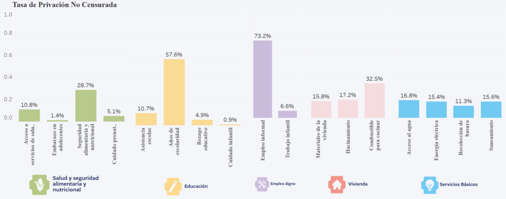 - Las privaciones más altas son empleo informal (74%), años de escolaridad (73.9%) y recolección de basura (58.6%).
