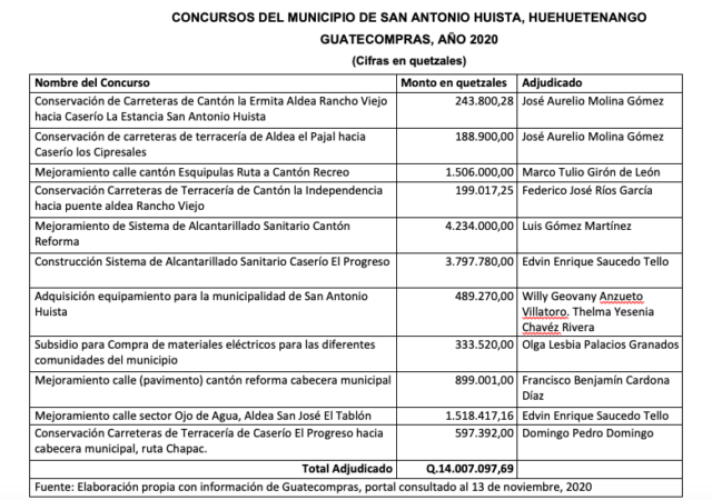 La municipalidad de San Antonio Huista, Huehuetenango, en lo que va de 2020, adjudicó Q14 millones 007 mil en 11 contratos. Uno de estos para la compra de equipo de oficina, otro para materiales eléctricos para las diferentes comunidades del municipio, dos contratos para alcantarillado sanitario y siete para conservación de carreras, según el portal de Guatecompras.