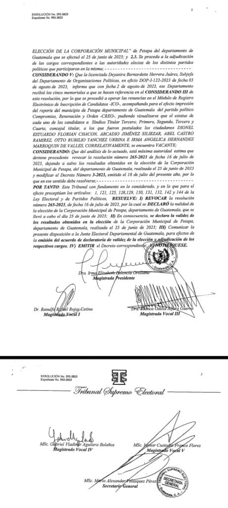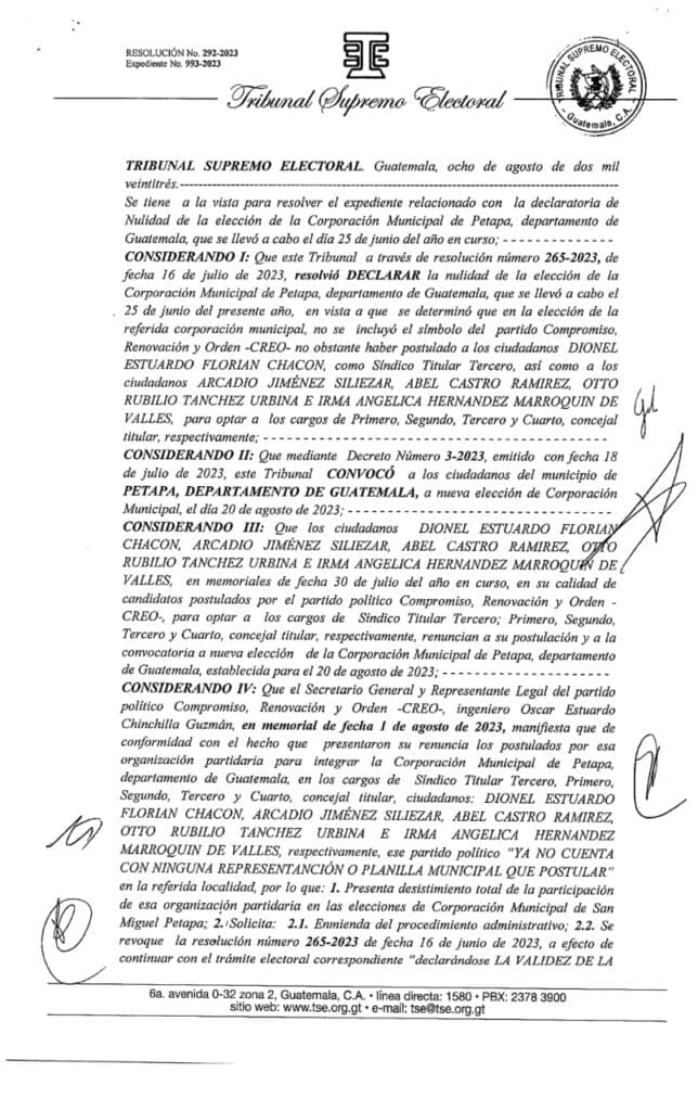 Seis integrantes de la planilla de Creo renunciaron. Por esa razón el Tribunal Supremo Electoral (TSE) revocó su decisión de realizar nuevos comicios.