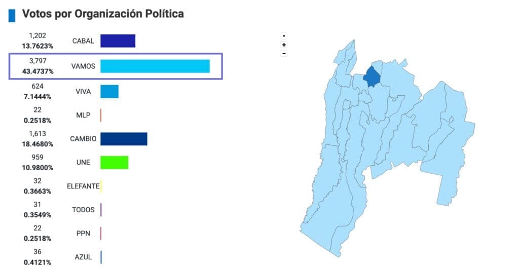 De sus vecinos recibió 3 mil 797 votos, el 43.47 % de quienes asistieron a emitir su sufragio. Marcó distancia del segundo lugar, el candidato del partido Cambio que logró 1 mil 613 votos.