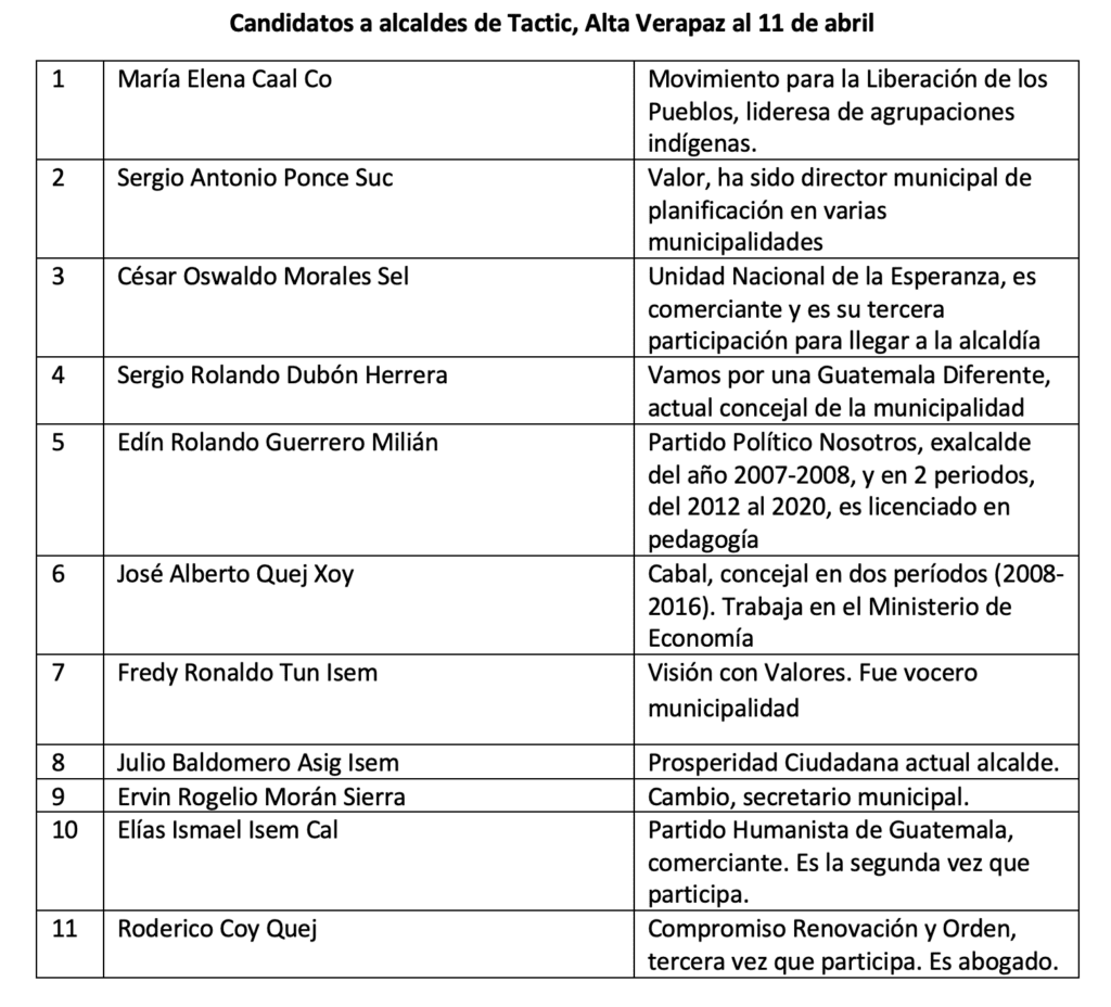 De las actuales once opciones que tienen los vecinos de Tactic para votar para alcalde, solo una mujer aparece inscrita. Se trata de María Elena Caal Co, del Movimiento para la Liberación de los Pueblos, quien tiene dentro su propuesta a otras dos mujeres como síndicas uno y dos, a Elsa Irene Mejía Xuc y Elva Leticia Bin Quej.
