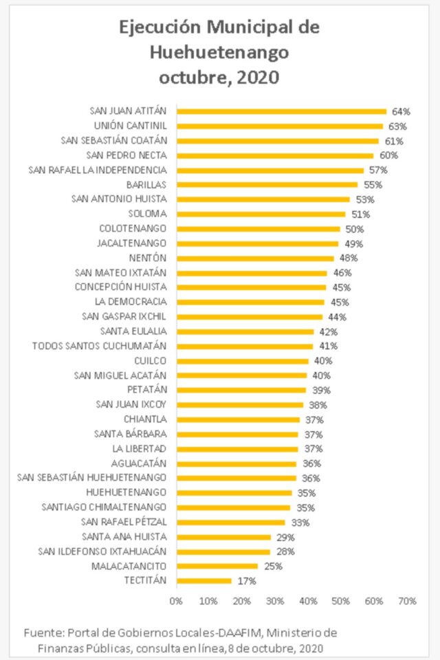 Del total de las 33 alcaldías, 24 están por debajo del 50 por ciento y nueve municipios están arriba del 51 por ciento de su ejecución. El más bajo es Tectitán con el 17 por ciento, de hecho, en el ranking de gestión municipal de la Secretaría de Planificación y Programación de la Presidencia (Segeplan) ocupa el puesto 292, de 340 municipios. Y San Juan Atitán es el que más ha ejecutado, 64 por ciento. En el ranking de Segeplan ocupa el puesto 252.