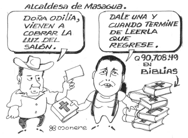 La exfuncionaria fue cuestionada en 2014 por obsequiar biblias a los pastores del municipio, la comuna pagó por ellas Q90,708.49. Ojoconmipisto la cuestionó por esta compra, se justificó en que fueron a manos de 1 mil 700 jóvenes de un instituto en el que un pastor, un sacerdote católico y un motivador les impartían charlas e incentivaban para que “no tomaran el rumbo del alcohol, ni de alguna droga, sino de decidir ser exitosos en la vida. El primer principio de la vida es tener la convicción de que Dios es real”.