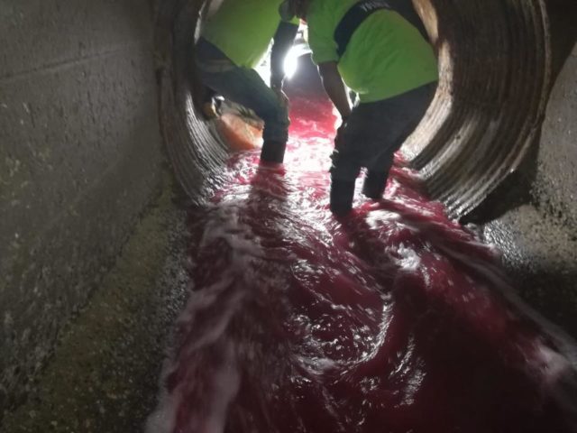 El agua que fluía en el colector era color rojo debido a un químico que vertía una empresa de textiles que operaba en el sector, según el alcalde. Foto: Facebook del alcalde Neto Bran.