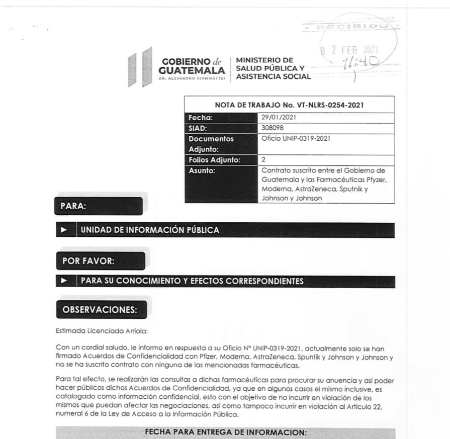 El ministerio de Salud negó a Ojoconmipisto copia de los acuerdos o contratos suscritos entre Guatemala y los laboratorios con los cuales negocia las vacunas para combatir la COVID-19: Pfizer, Moderna, AstraZeneca, Sptunik y Jonhson & Jonhson.