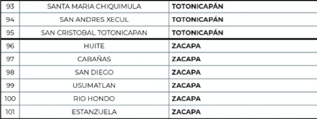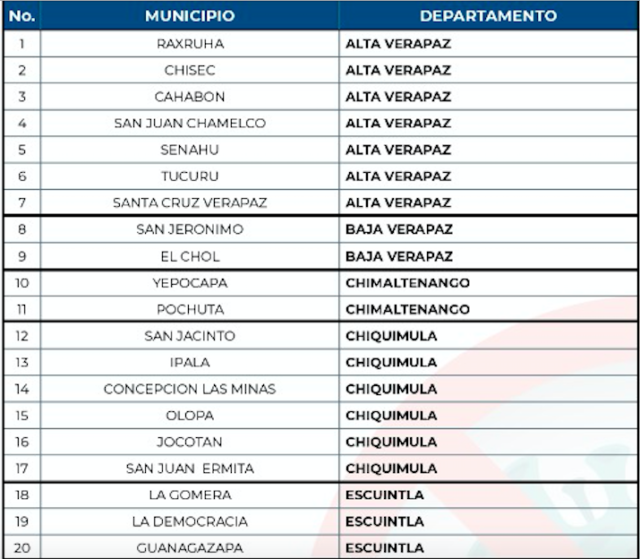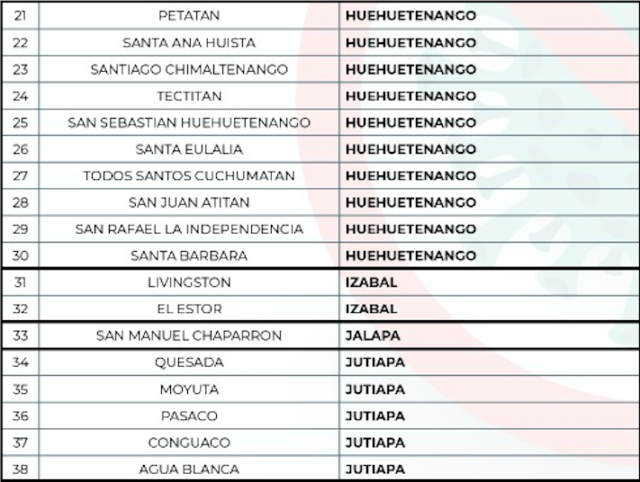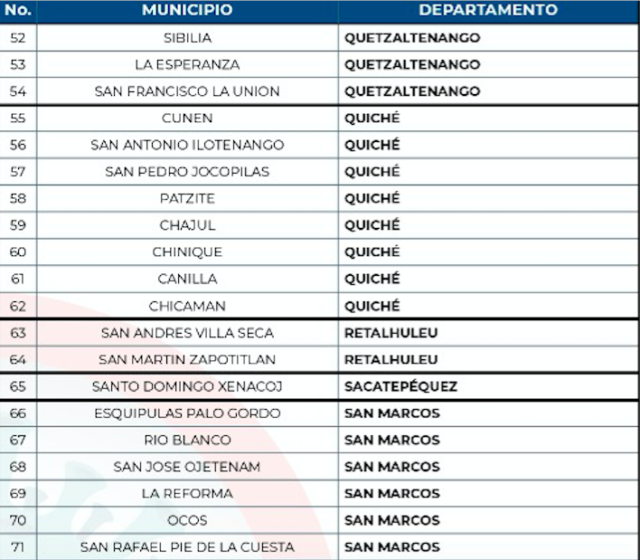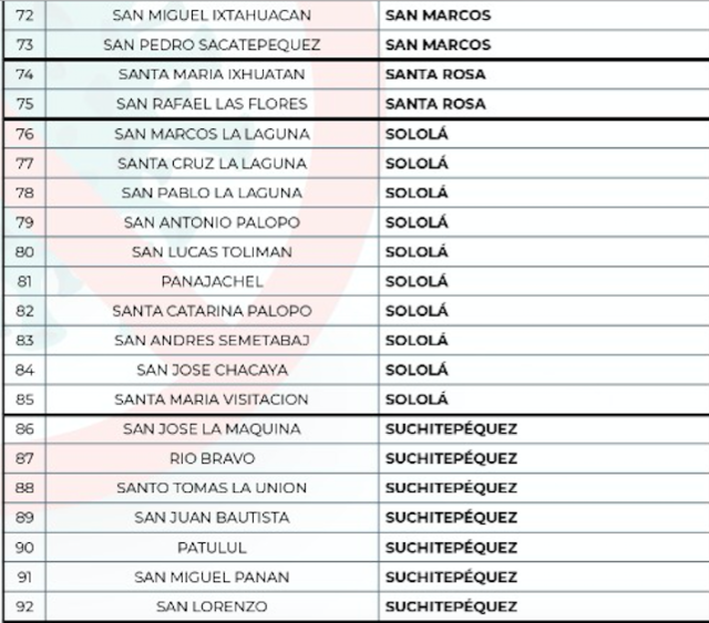 Esta tarde el ministro de Salud, Hugo Monroy, indicó que hay 101 municipios donde no se registran pacientes positivos de coronavirus, casi una tercera parte del país. En este listado no figuran los departamentos de Guatemala (17 municipios) ni El Progreso (ocho municipios), lo que significa que todos han reportado algún caso.