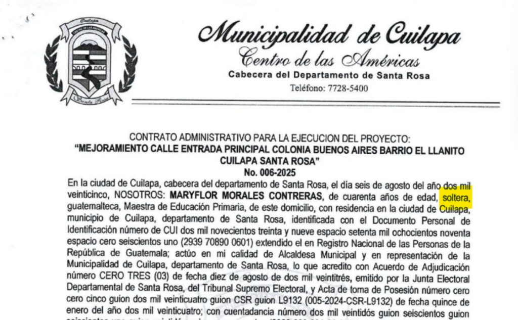 Sin embargo, en un contrato firmado por la misma jefa edil, se muestra como soltera.