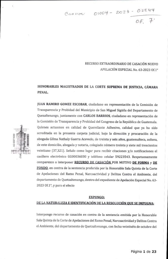 Por ello, Carlos Barrios, de la Comisión de Transparencia y Prioridad de Quetzaltenango, colocó un recurso de casación ante la Corte de Constitucionalidad (CC) “para que no quede impune” el exfuncionario a quien dictaron sentencia el 6 de diciembre de 2022.