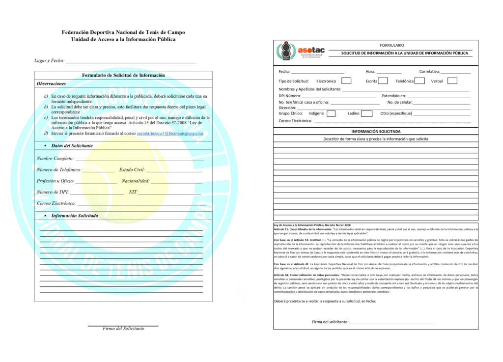 Para el caso de la Federación de Tenis de Campo y la Asociación Deportiva Nacional de Tiro con Armas de Caza (Asotac), solicitan datos adicionales en sus formularios, como: DPI y lugar de extensión, estado civil, profesión u oficio, dirección, nacionalidad, NIT y firma del formulario.
