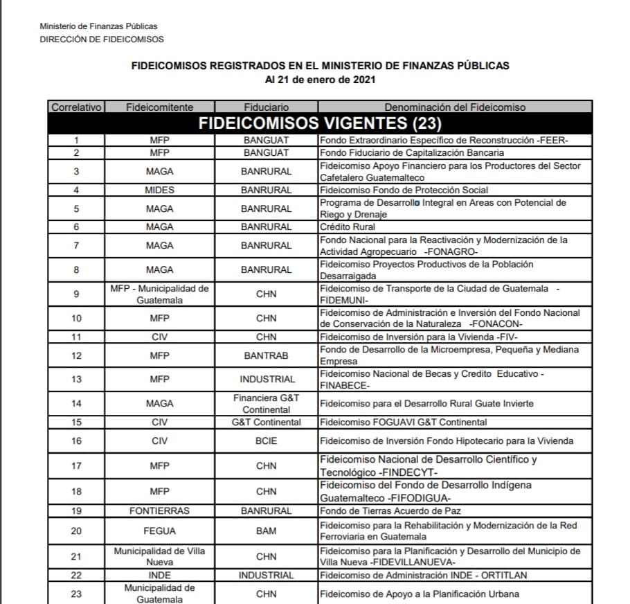 El ministerio de Finanzas Públicas (Minfin) presentó el Portal de Fideicomisos que contiene información sobre cómo 23 entidades de este tipo administran los fondos públicos. Sin embargo, al revisar en un buscador habilitado no hay información de dos.