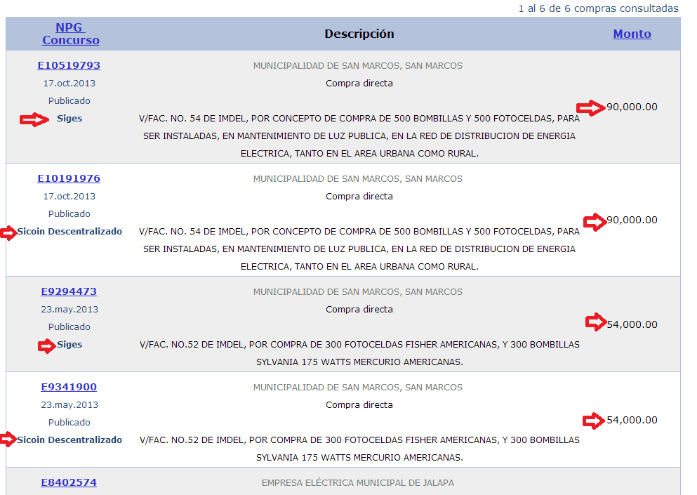 1. La Municipalidad publicó en Guatecompras las compras en Siges y Sicoin, lo que generó dos NPG distintos para cada una. La primera fue el 23 de mayo (300 fotoceldas y 300 bombillas por Q54mil) y la segunda (500 bombillas y 500 fotoceldas), el 17 de octubre de 2013.