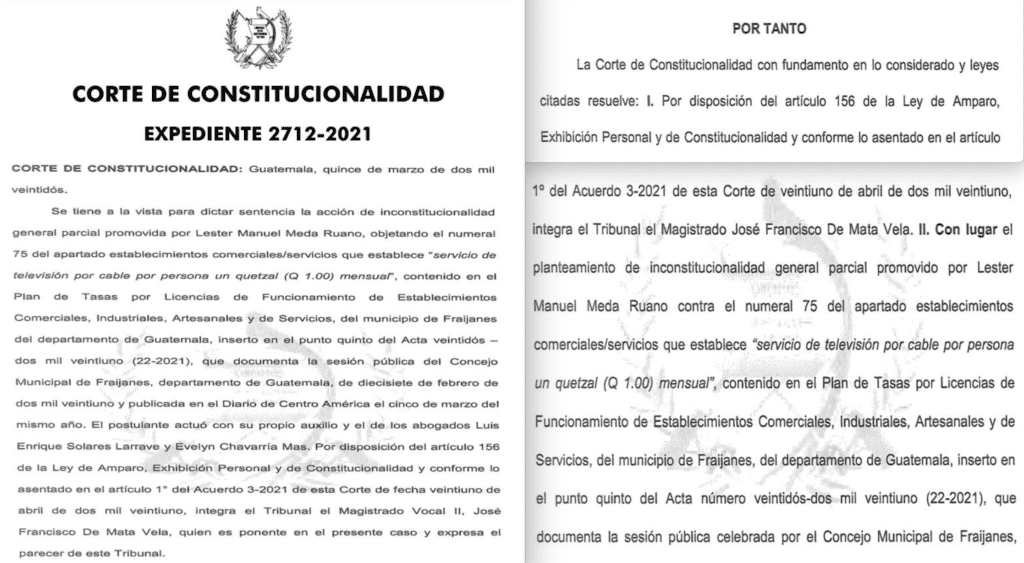El concejo municipal de Fraijanes, Guatemala, aprobó el 24 de febrero de 2021 su nuevo plan de tasas por licencias de funcionamiento de establecimientos abiertos al público. En su tabla incluía cobrar a las empresas de servicio de cable Q1 por cada usuario suscrito, pero un año después la Corte de Constitucionalidad (CC) responde que este tipo de cargos son ilegales y por lo tanto prohibió a la institución llevar a cabo esta medida.