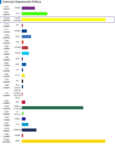En las elecciones de 2023, los partidos quedaron en el mismo orden, pero con una diferencia menor. Sin embargo, el TSE aún no oficializa cuántas personas de cada organización entrarán a la corporación.