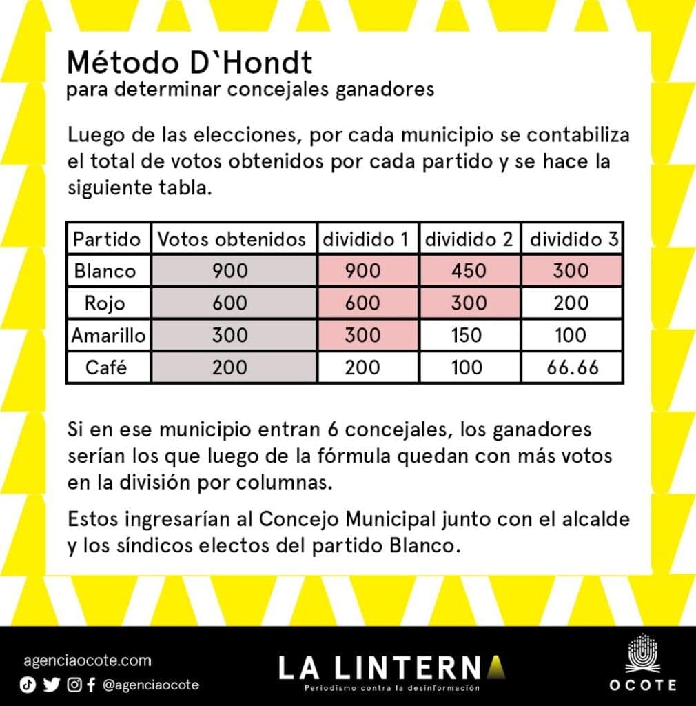 Tras los comicios, se utiliza el método de representación de minorías (método D’Hondt) para determinar cuántas personas de cada partido entrarán como concejales según los votos recibidos, como dicta el artículo 203 de la LEPP. Es decir, el jefe edil no asumirá con toda su planilla, sino con una parte proporcional según la preferencia del voto.