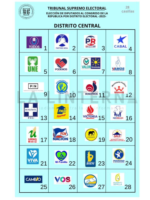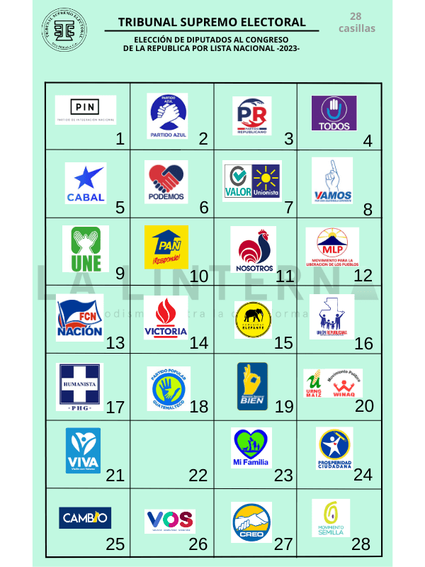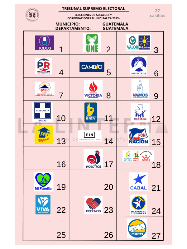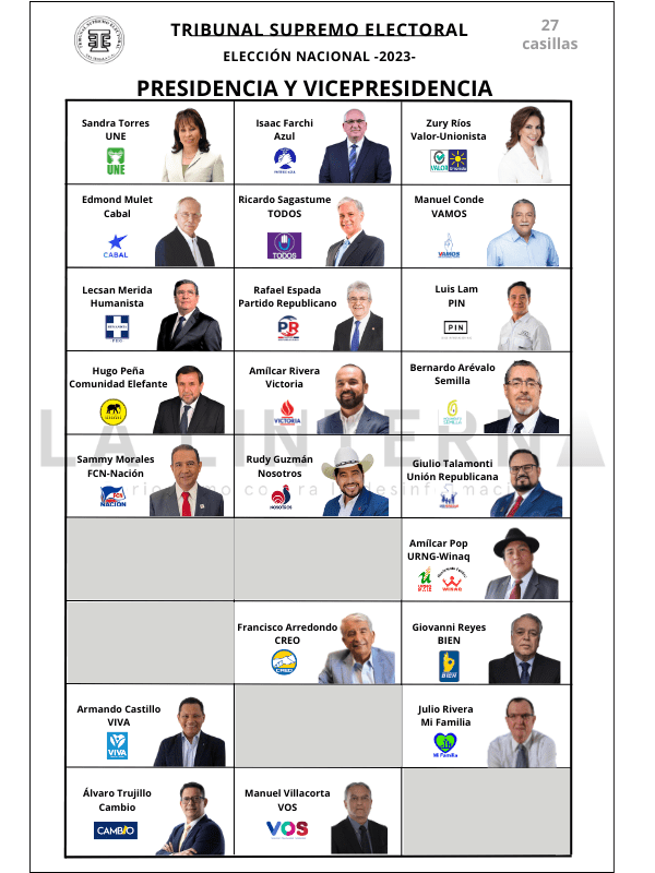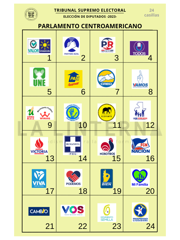 La papeleta en la que la ciudadanía vota por estos cargos es de color blanco. En cada casilla de esa papeleta irá publicada la foto de los 22 binomios presidenciales y el emblema de 24 partidos, pues hay dos candidaturas que van en alianza: Valor-Unionista, y URNG Maíz-Winaq.