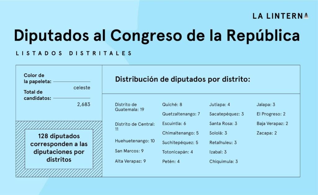 El segundo grupo de candidatos que integran este organismo está representado en los diputados distritales. El artículo 157 de la Constitución plantea que Guatemala está conformada por 23 distritos electorales, que representan a los departamentos que conforman la República más la Capital.