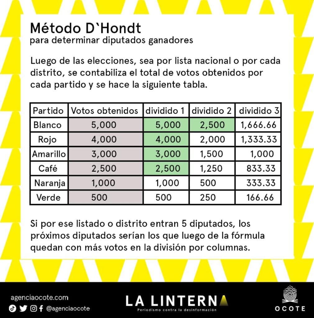 Edgar Ortiz, abogado constitucionalista, explica que este método es proporcional a la cantidad de votos que un partido pueda tener. El partido con mayor cantidad de votos tendrá más diputados, pero la fórmula también permite que ingrese representación de partidos minoritarios según el método descrito.