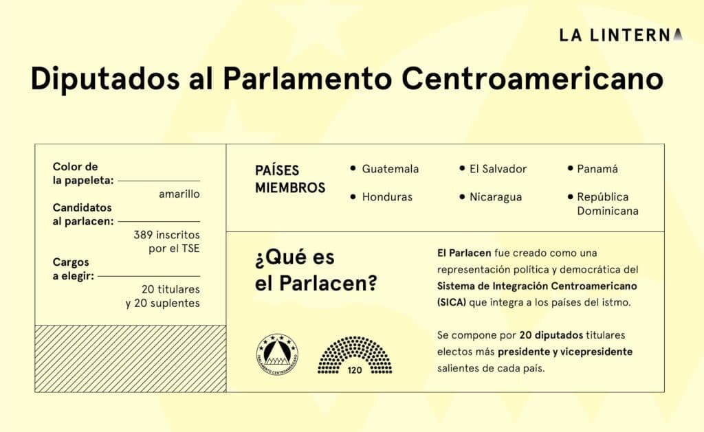 En la papeleta de color amarillo se elegirá a los diputados que representarán a Guatemala en el Parlamento Centroamericano (Parlacen). Son 20 diputados los que serán electos por medio del voto popular.