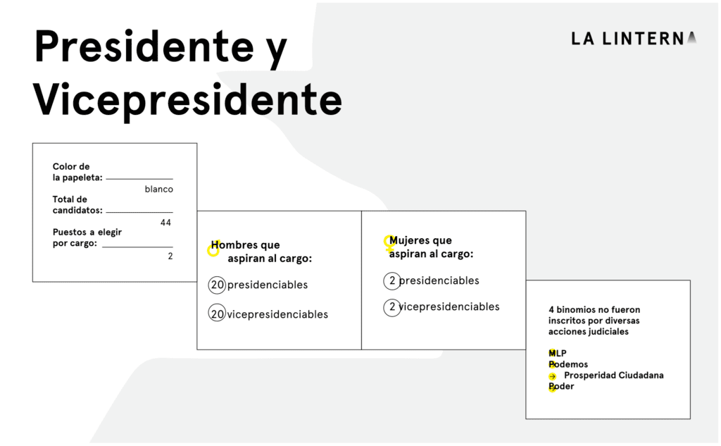 Los más altos cargos del Organismo Ejecutivo: presidente y vicepresidente, se elegirán entre 22 binomios presidenciales inscritos a la fecha, luego de que el Tribunal Supremo Electoral (TSE) declarara vacantes las candidaturas de cuatro partidos: Movimiento Para la Liberación de los Pueblos (MLP), Podemos, Prosperidad Ciudadana y Poder.