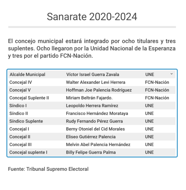 Víctor Israel Guerra Zavala recibió el pasado 19 de agosto, de manos de la Junta Electoral Departamental de El Progreso, el acuerdo y la credencial emitidas por el Tribunal Supremo Electoral que lo acreditan como alcalde de Sanarate. Este cargo lo ejercerá a partir del 15 de enero de 2020 tras derrotar con 8 mil 782 votos a César Augusto Rodas Álvarez, quien dirige esta municipalidad desde hace 19 años.