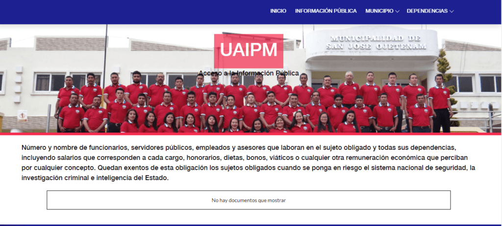 Ojoconmipisto revisó los portales electrónicos de las alcaldías y encontró cuatro donde la sección de acceso a la información pública está vacía. Por ejemplo, en el portal de San Pablo la Laguna, Sololá, se encuentran las casillas donde iría cada archivo municipal, pero al entrar en ellas no hay nada.