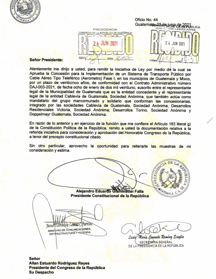 Alessandra Gallio, concejala II, aseguró por escrito que el alcalde Ricardo Quiñónez envió una carta el presidente Giammattei el 16 de junio, cuyo despacho recibió el día 21. En el oficio el jefe edil aseguró que la inversión en el teleférico se realizará con capital privado (nacional y extranjero) por un monto de al menos US$150 millones propuesto por la empresa Cable Vía, Doppelmayr, Residenciales Torino y Desarrollo Residenciales Victoria.