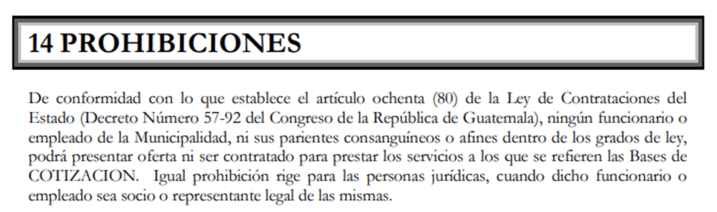 Se buscó conocer con Mónica Monge, vocera de la Contraloría General de Cuentas (CGC), si existe alguna prohibición que limite a la comuna suscribir un contrato con la esposa de un empleado municipal, pero no se obtuvo respuesta al cierre de esta nota.