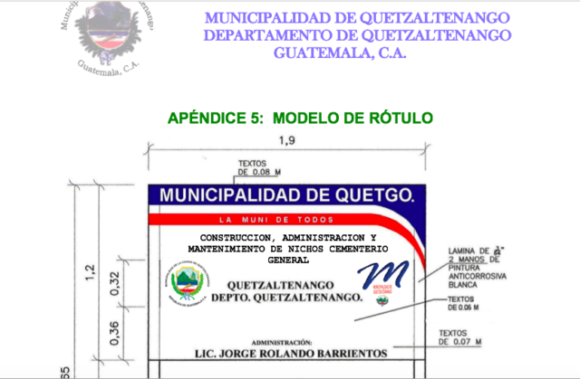 Se trata del “Servicio público de construcción y mantenimiento de nichos en el Cementerio General de Quetzaltenango”, adjudicado a la empresa J.F Bienes Raíces cuyo representante legal es Juan Fernando López Fuentes.