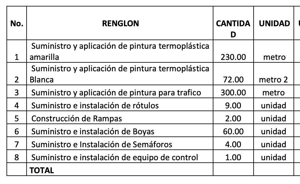Se trata de señalización vertical y horizontal de cuatro cuadras entre zonas 1 y 2 de Canillá, Quiché. Esto incluyó 60 boyas, dos rampas, nueves rótulos, cuatro semáforos y pintura Q280 mil (NOG 14243474). Solo se presentó una oferta, la de Luis Carlos Roldán Aosa.
