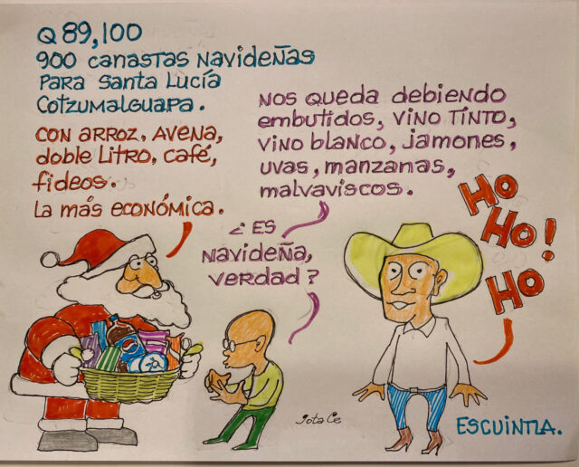 A través de compra directa la municipalidad de Santa Lucía Cotzumalguapa, Escuintla, adquirió 900 canastas navideñas para miembros de los Consejos Comunitarios de Desarrollo (cocode) y empleados de la comuna como un beneficio del pacto colectivo 2014–2015.