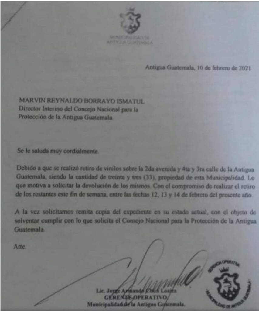 El 2 de febrero, el Conservador interino, Marvin Borrayo, notificó a las autoridades municipales que no contaban con la autorización, como ordena el artículo 36 inciso H de la Ley Protectora de Antigua Guatemala.