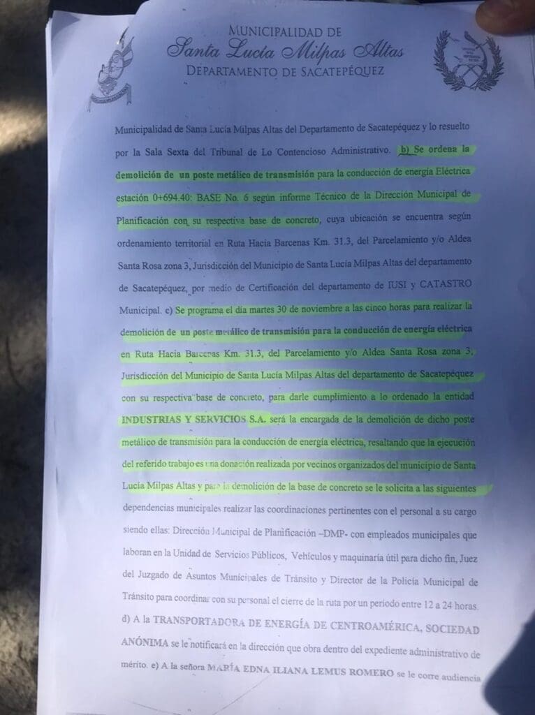La jueza de asuntos municipales de Santa Lucía Milpas Altas, Dora Yanet Acajabón Monzón, ordenó demoler un poste metálico para transmisión de energía eléctrica, propiedad de Transportadora de Energía de Centroamérica, Sociedad Anónima (Trecsa) por no contar con la licencia municipal.