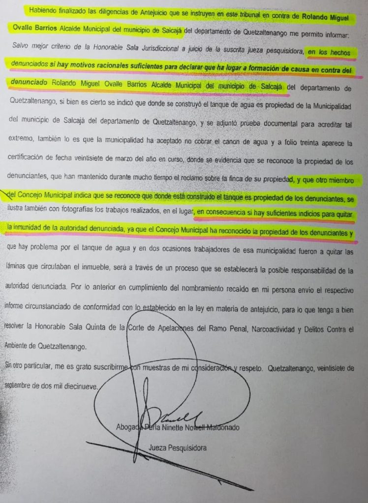 «Sí hay motivos racionales suficientes para declarar a lugar la formación de causa en contra del denunciado Rolando Miguel Ovalle Barrios, Alcalde del municipio de Salcajá», se lee en la resolución de la jueza pesquisidora, Perla Nowell.