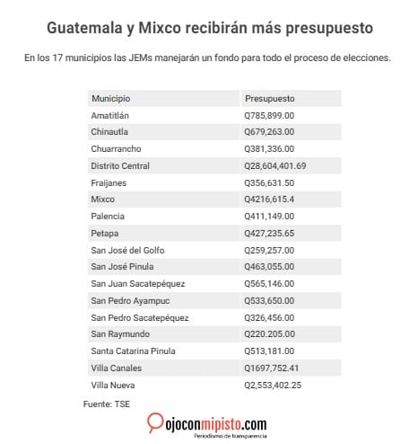 Para estos comicios el Tribunal Supremo Electoral (TSE) asignó un presupuesto de Q41.4 millones para las 17 Juntas Electorales Municipales (JEM) del departamento de Guatemala. El distrito central –cabecera departamental– es el que mayor recursos recibirá seguido de Mixco y Villa Nueva.